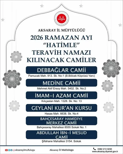 2026 Yılı Ramazan Ayı, İlimizde Hatimle Teravih Namazı Kılınacak Camiler açıklandı