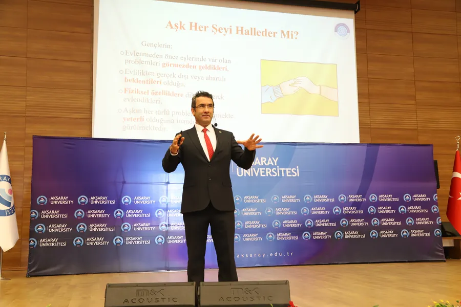 Aksaray Üniversitesi’nde düzenlenen “Denge Sanatı: Kalp mi, Zihin mi, Cüzdan mı?” konulu konferansta konuşan Öğr. Gör. Dr. Ali Bozgedik, aile kurumunun sürdürülebilirliği için eşlerin karşılıklı fedakârlık ve anlayış göstermesi gerektiğini vurguladı.