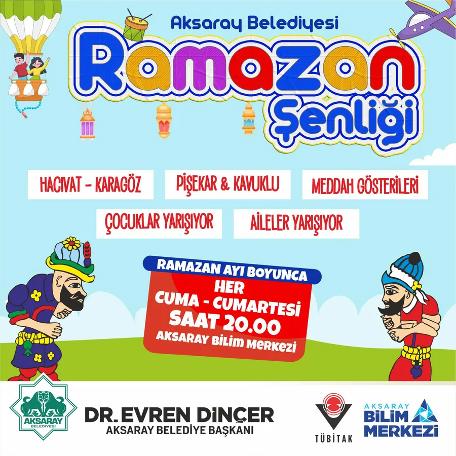 Ramazan Şenliği, Ramazan ayı boyunca her cuma ve cumartesi günü saat 20.00’de Aksaray Bilim Merkezi’nde gerçekleştirilecek. Ailelerin çocuklarıyla birlikte katılım sağlayabileceği programlarda, geleneksel Ramazan kültürünün yaşatılması hedefleniyor.