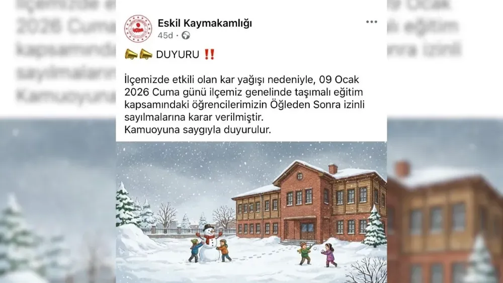 Eskil ilçesinde etkili olan yoğun kar yağışı, eğitimi de olumsuz etkiledi. Eskil Kaymakamlığı, hava koşulları nedeniyle 9 Ocak 2026 Cuma günü ilçede taşımalı eğitim kapsamında öğrenim gören öğrencilerin öğleden sonra izinli sayılmasına karar verildiğini duyurdu.