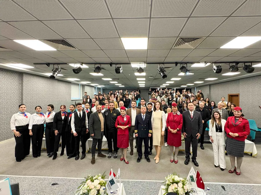 Mesleki bilgi paylaşımının yapıldığı ve sivil havacılık kurallarının ele alındığı konferans; KTO Karatay Üniversitesi Rektörü Prof. Dr. Fevzi Rifat Ortaç, Türk Hava Yolları Sorumlu Kaptan Pilotu Celal Bek, Türk Hava Yolları Kabin Amiri Yasemin Demirel, Türk Hava Yolları Kabin Memurları Tuğçe Özev, Enes Bilgin ve Alev Doğan’ın yanı sıra Sivil Havacılık Kabin Hizmetleri Programı ile Pilotaj Bölümü akademisyen ve öğrencilerinin yoğun katılımıyla gerçekleştirildi.