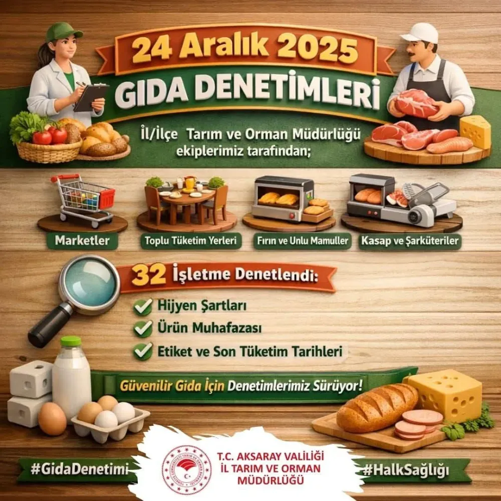 İl Tarım ve Orman Müdürlüğü ekiplerince 24 Aralık 2025 tarihinde il genelinde gerçekleştirilen gıda denetimleri kapsamında, farklı sektörlerde faaliyet gösteren toplam 32 işletme denetlendi. Yapılan denetimlerle vatandaşların güvenilir ve sağlıklı gıdaya ulaşması hedeflendi.