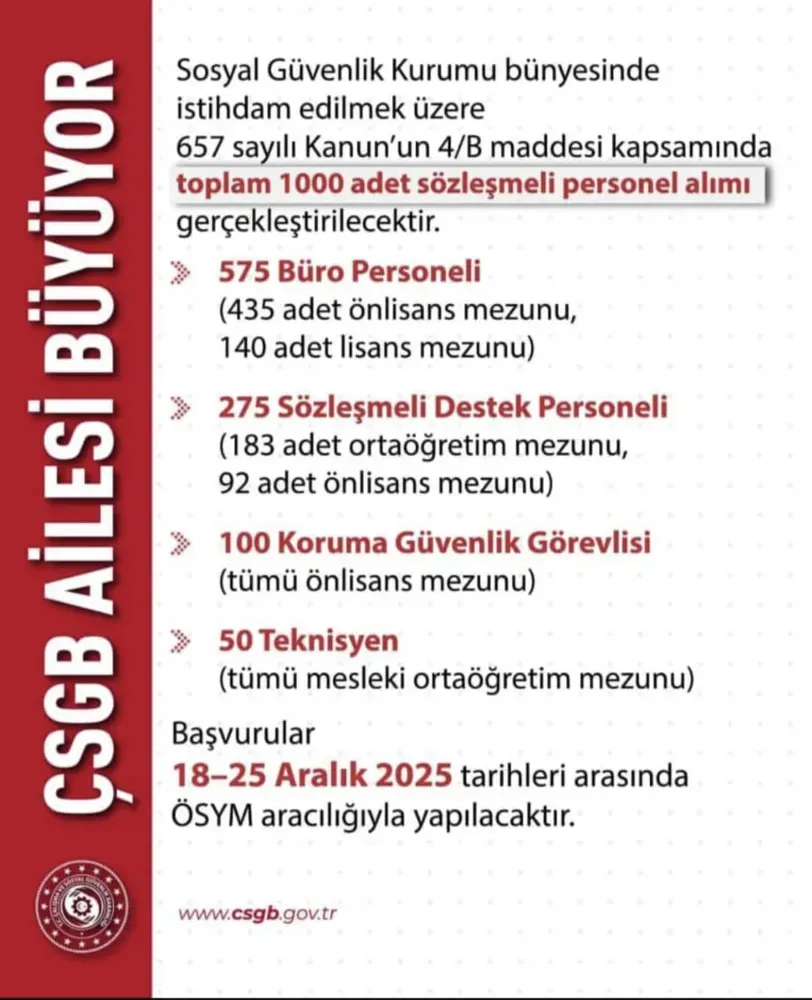 Sosyal güvenlik kurumu bünyesinde istihdam edilmek üzere 657 sayılı Kanun’un 4/B maddesi kapsamında toplam 1000 adet sözleşmeli personel alımı gerçekleştirilecek.