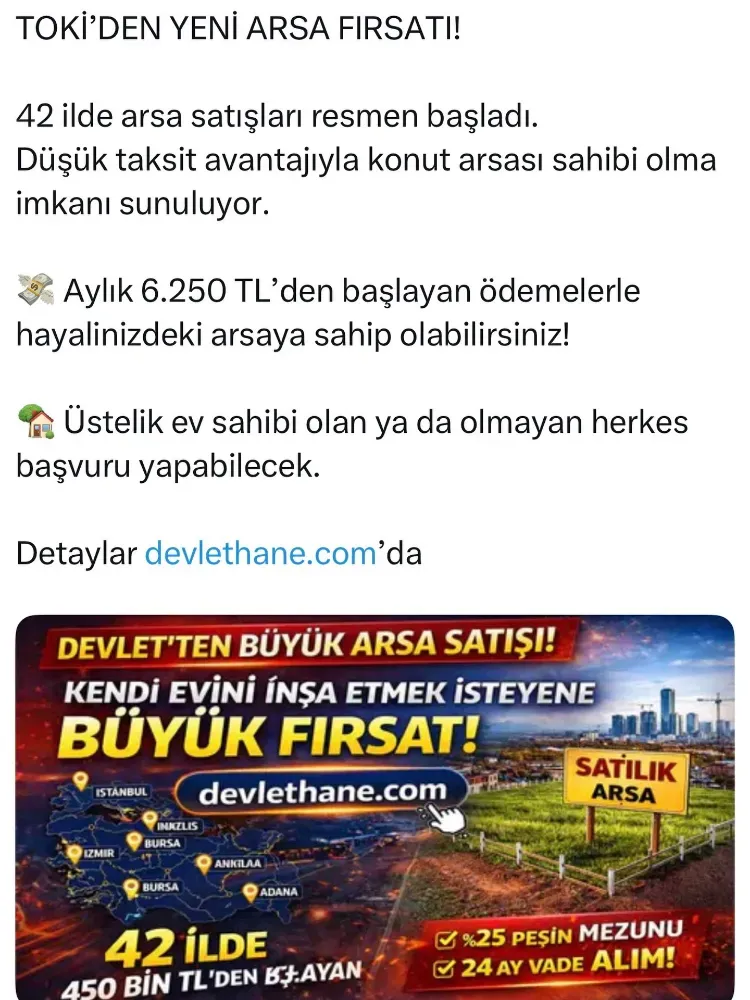 42 ilde arsa satışı başladı, aylık 6.250 TL taksitle sahip olabilirsiniz.